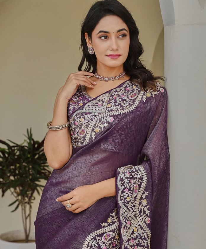 Transitioning to another striking color, the purple saree represents luxury, creativity, and individuality. It offers a bold yet refined option for festive and formal events.